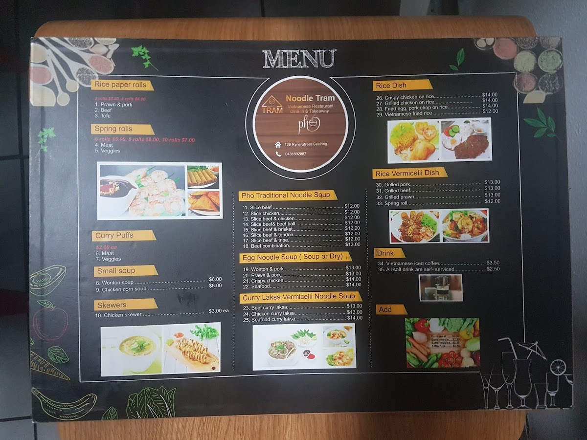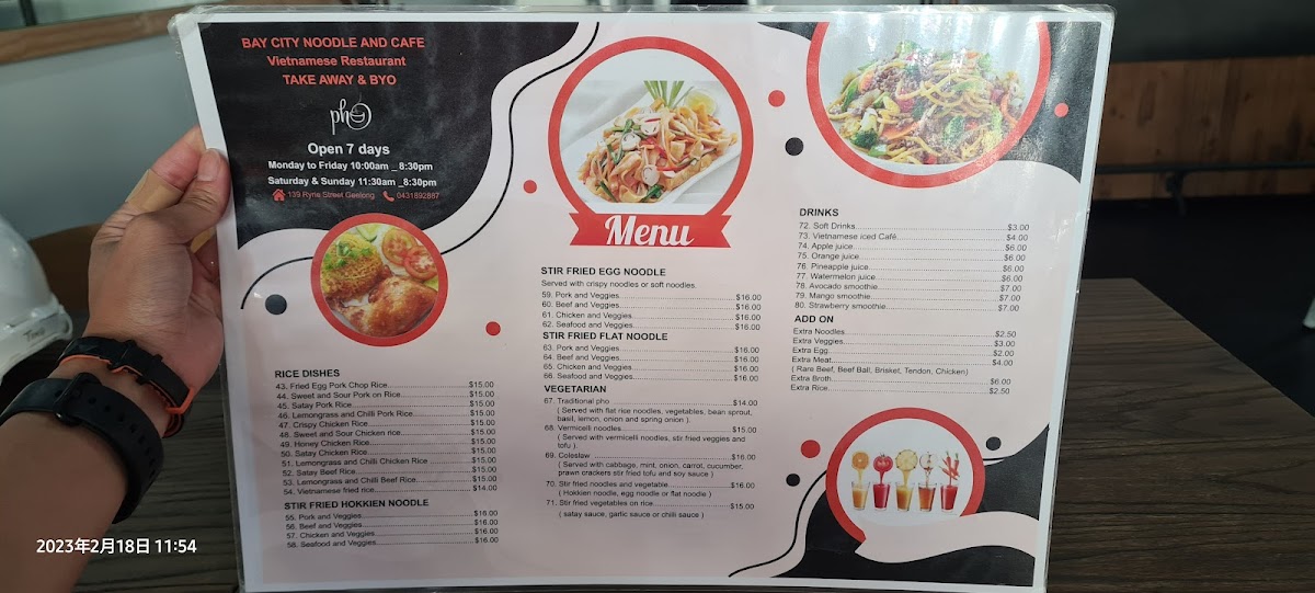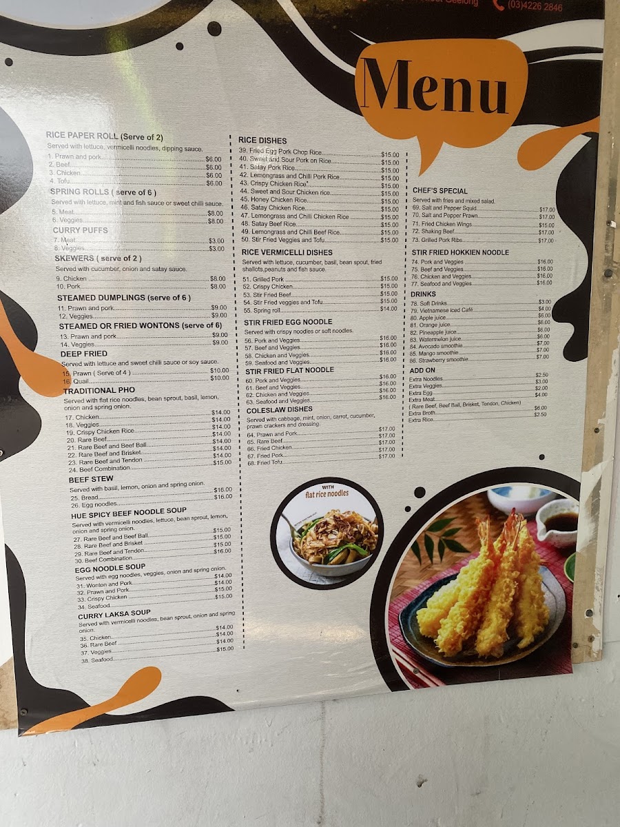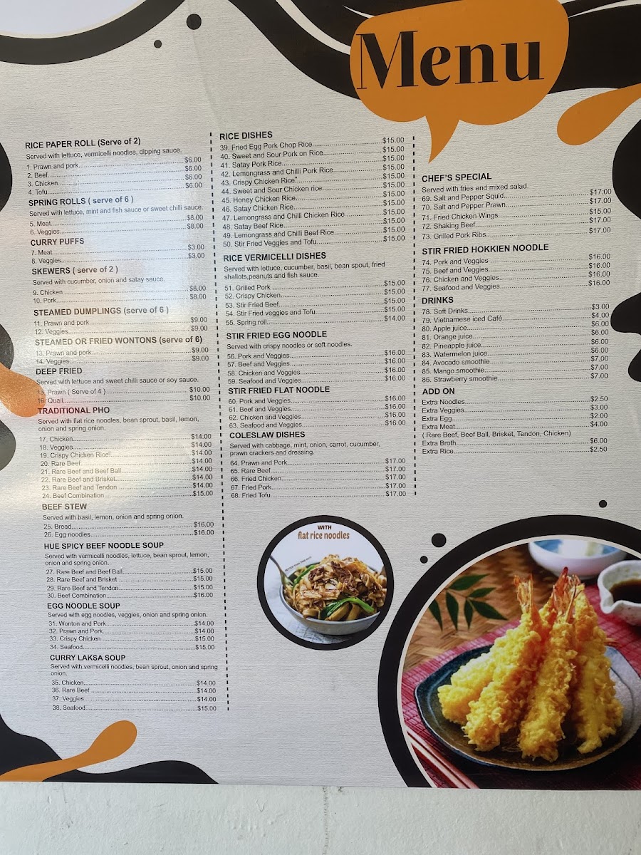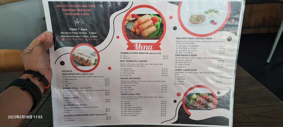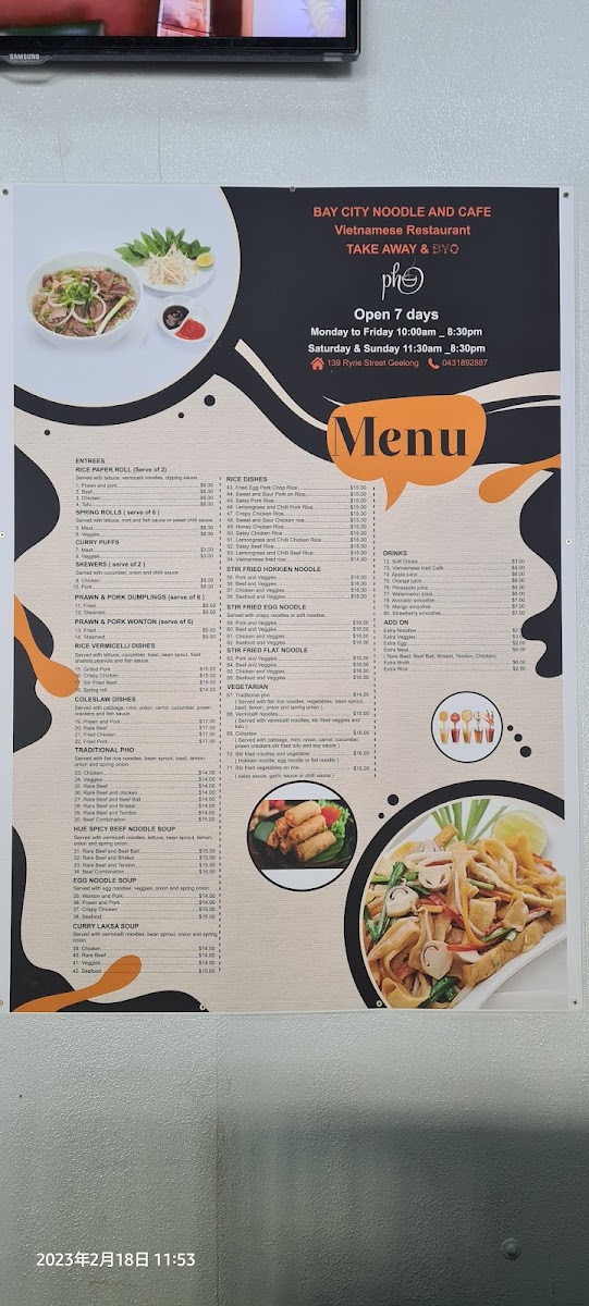 Bay City Noodles offers a diverse menu with a variety of delicious options, ranging from soups and noodle dishes to rice vermicelli and skewers. Their Egg Noodle Soups include options like Wonton And Pork Egg Noodle Soup, Crispy Chicken Egg Noodle Soup, and Prawn And Pork Egg Noodle Soup, each crafted with rich, flavorful broths. The Rice Vermicelli Dishes feature Fried Chicken Rice Vermicelli and Grilled Pork Rice Vermicelli, while the Skewers section presents simple yet satisfying Chicken and Pork Skewers. For those craving something heartier, the Stir-Fried Noodles come in multiple variations, such as Beef And Veggies Stir-Fried Egg Noodles and Prawn And Veggies Stir-Fried Hokkien Noodles. Additionally, the Hue Spicy Beef Noodle Soup and Traditional Pho options offer comforting bowls, with choices like Beef Combination Huey Spicy Beef Noodle Soup and Rare Beef And Beef Ball Pho. Curry Laksa Soup enthusiasts can indulge in Prawn Curry Laksa Soup or Beef Curry Laksa Soup. The restaurant also has an array of Entrées, including Prawn And Pork Rice Paper Rolls and Tofu Rice Paper Rolls, alongside Prawn and Pork Wontons in both steamed and fried versions. For those preferring rice, dishes like Crispy Chicken Rice and Sweet And Sour Chicken Rice offer satisfying options. To round off the meal, Bubble Tea, Vietnamese Iced Coffee, and other drinks are available. Overall, Bay City Noodles provides a well-rounded menu catering to all tastes, with a clear emphasis on fresh, flavorful ingredients and classic Vietnamese comfort food.